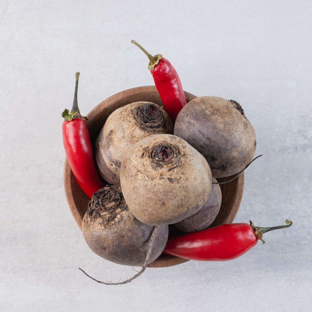 Beetroot is a nutritious root vegetable known for its deep red color and natural sweetness. It is commonly used in salads, curries, and juices. Beetroot supports blood circulation and stamina due to its nitrate content.